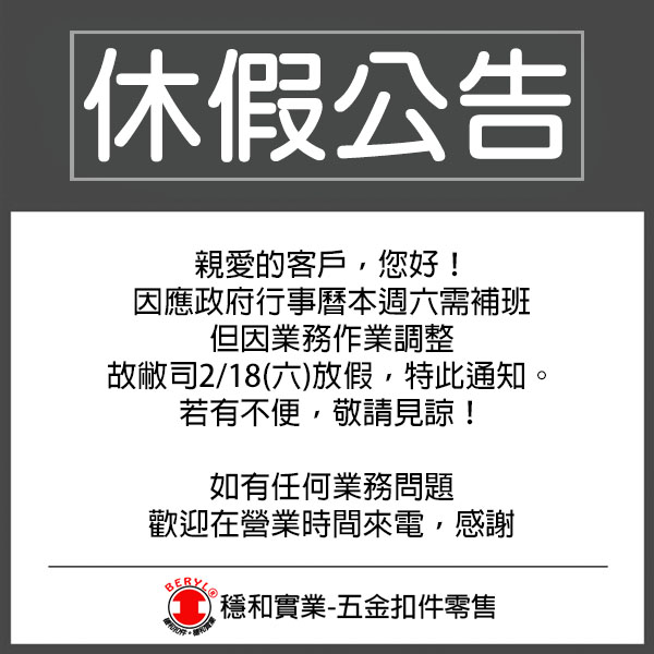 穩和實業-2/18 休假公告 發布日期:17 Feb 2023 親愛的客戶,您好!因應政府行事曆本週六需補班但因業務作業調整故敝司2/18(六)放假,特此通知。若有不便,敬請見諒!如有任何業務問題歡迎在營業時間來電,感謝