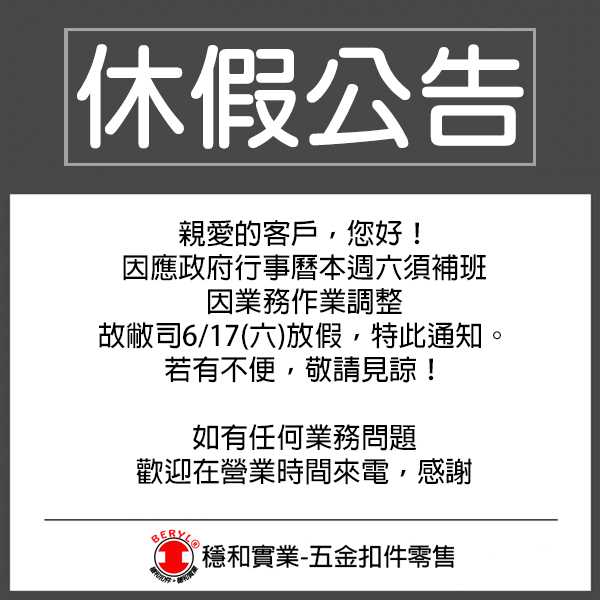 6/18補班日休假公告 發布日期:16 Jun 2023 親愛的客戶,您好!因應政府行事曆本週六須補班因業務作業調整 故敝司6/17(六)放假,特此通知。若有不便,敬請見諒! 如有任何業務問題 歡迎在營業時間來電,感謝
